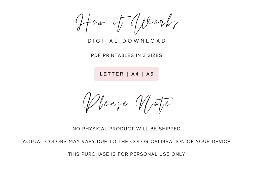 You will receive A4, A5, Letter sizes PDF's ready to print